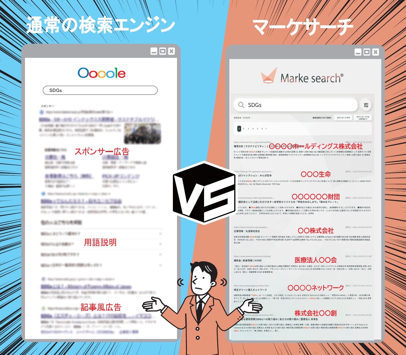 通常の検索エンジンでは、上記比較図のように「スポンサー広告」、「用語解説」、